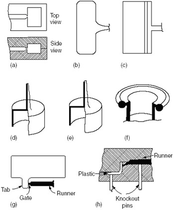 FIGURE PP.11 Gating design: (a) edge; (b) fan; (c) flash; (d) sprue; (e) diaphragm; (f) ring; (g) tab; (h) submarine. When the gate leads directly into the part, there may be surface imperfection due to jetting. This may be overcome by extending a tab from the part into which the gate is cut. This procedure is called tab gating (FIGURE PP.14g). The tab has to be removed as a secondary operation. A submarine gate (FIGURE PP.11h) is one that goes through the steel of the cavity. It is very often used in automatic molds. |