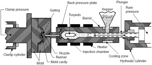 A diagram of a typical injection-molding machine is shown in FIGURE PP.6. Granular material (the plastic resin) falls from the hopper into the barrel when the plunger is withdrawn. The plunger then pushes the material into the heating zone, where it is heated and softened (plasticized or plasticated). Rapid heating takes place due to spreading of the polymer into a thin film around a torpedo. The already molten polymer displaced by this new material is pushed forward through the nozzle, which is in intimate contact with the mold. The molten polymer flows through the sprue opening in the die, down the runner, past the gate, and into the mold cavity. The mold is held tightly closed by the clamping action of the press platen. The molten polymer is thus forced into all parts of the mold cavities, giving a perfect reproduction of the mold.